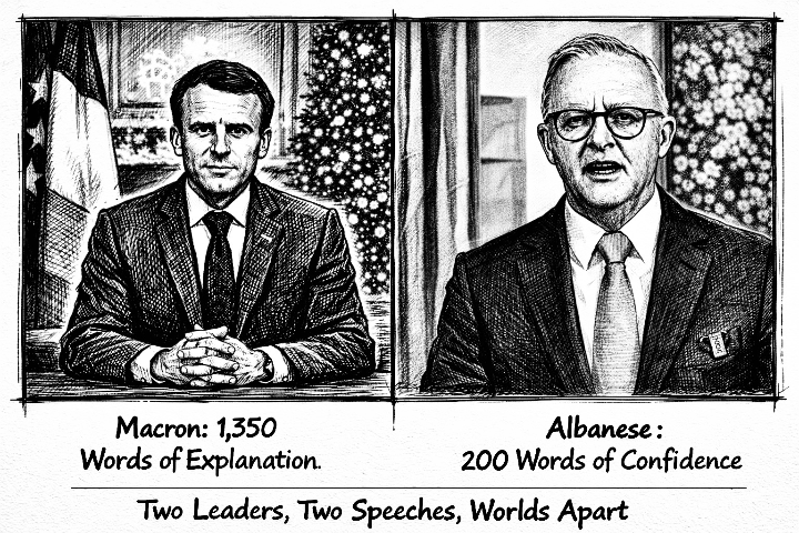 The contrast was visceral. Not just the length. The whole performance. Macron had to command attention, demand it, explain why France should listen. Albanese assumed Australians already were.